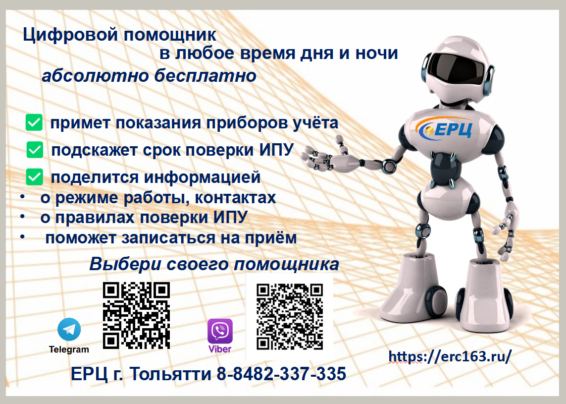 Чат-бот «ЕРЦ г.Тольятти» это бесплатный круглосуточный сервис, в котором кроме передачи показаний, можно будет уточнить дату поверки приборов учёта, а также получить справочную информацию о режиме работы ЕРЦ, контактах и каналах связи.
