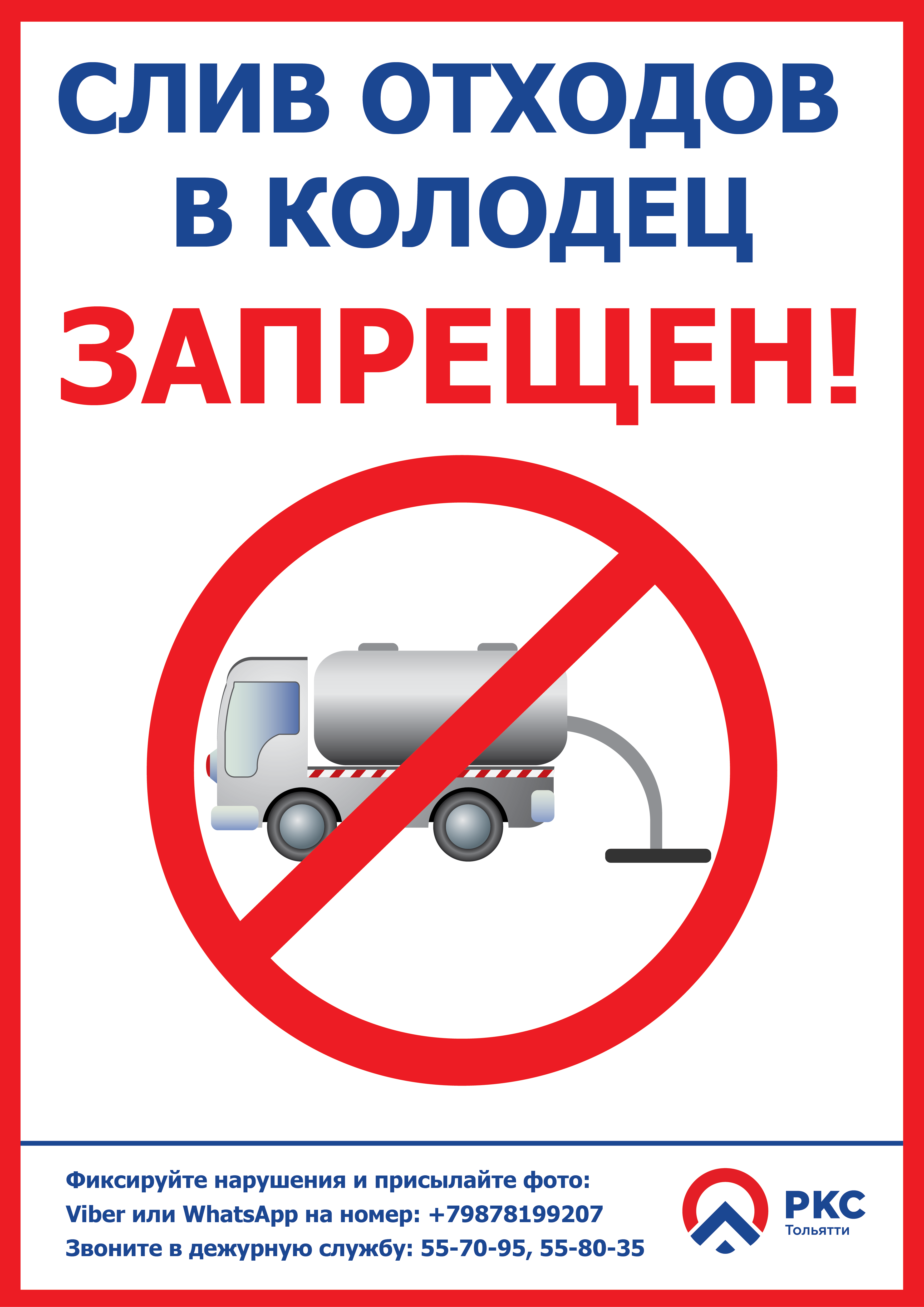 Если Вы стали свидетелем несанкционированного слива в централизованную систему водоотведения, не оставайтесь равнодушными. Фиксируйте нарушителей и присылайте фото и видео на Viber, WhatsApp: +7-987-819-92-07. Или звоните в оперативно-дежурную службу по телефону: 55-70-95, 55-80-35.